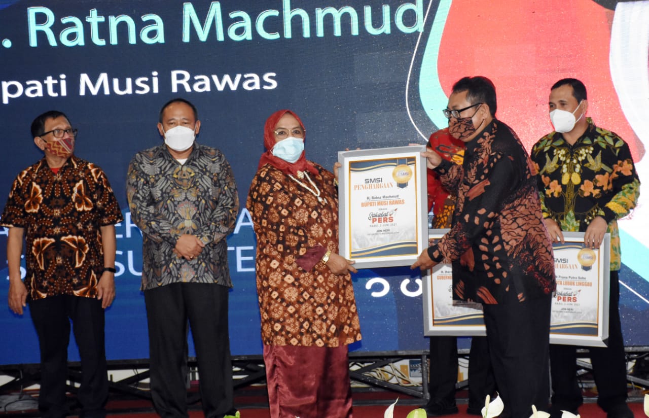 LUBUKLINGGAU Jodanews.com, – Bupati Musi Rawas Hj Ratna Machmud melalui Wakil Bupati Musi Rawas Hj Ratna Machmud Hj Suwarti menerima penghargaan Sahabat Pers yang di berikan organisasi perusahaan pers media online Serikat Media Siber Indonesia (SMSI) Sumsel dalam acara Malam Anugerah Penghargaan Sahabat Pers yang merupakan puncak acara Forum Silaturahmi Media Online Se Sumatera Selatan di Smart Hotel, Kota Lubuklinggau, Rabu (2/6/2021).
