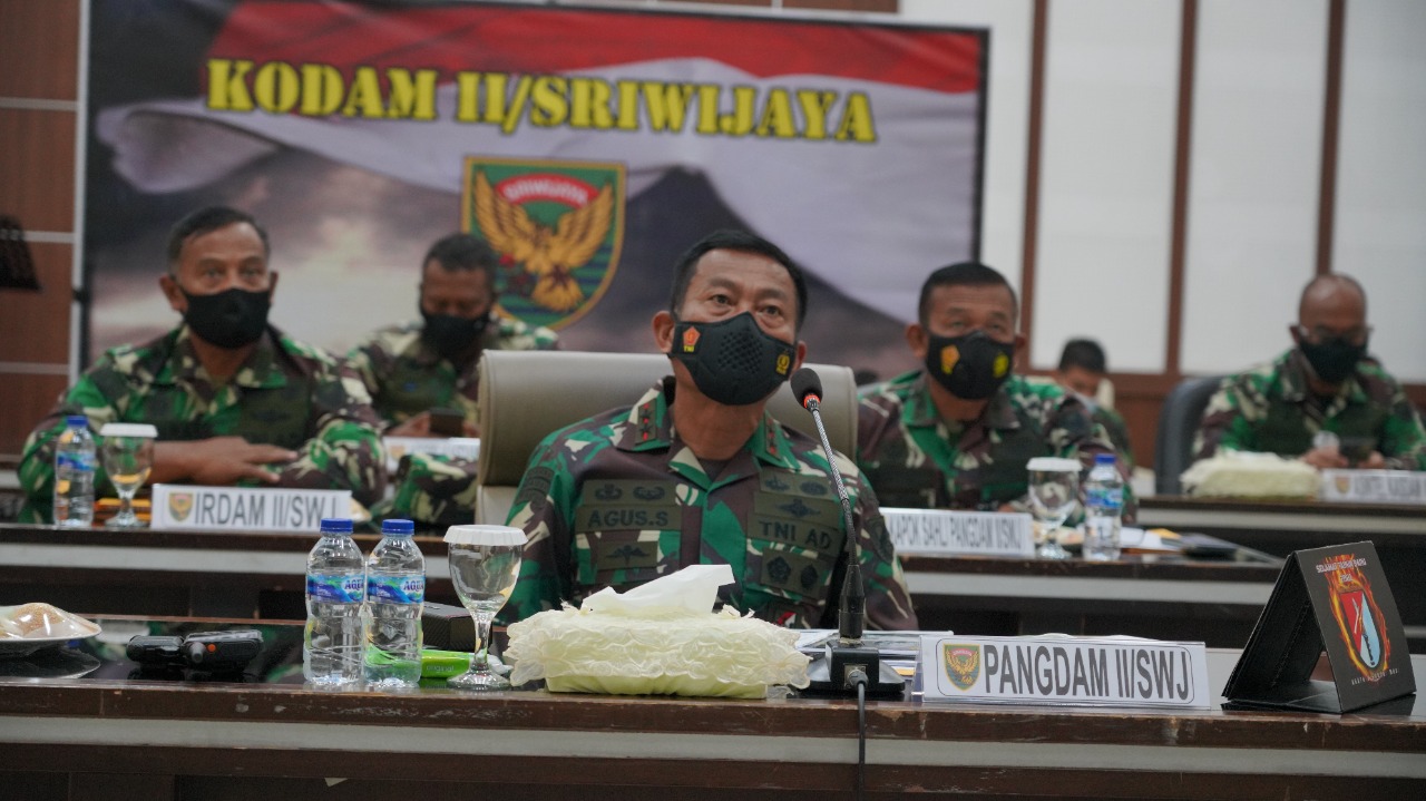 PALEMBANG, Jodanews.com – Pangdam II/Sriwijaya, Mayjen TNI Agus Suhardi mengikuti Video Conference (Vicon) Mobile Training Team (MTT) Security Force Assistance Brigade (SFAB) Gelombang – III antara TNI AD dengan AD Amerika Serikat (US Army) TA 2021, di Ruang Gatot Subroto (Gatsu) Makodam II/Swj, Jalan Jenderal Sudirman KM. 2,5 Palembang, Sabtu (7/8/2021).